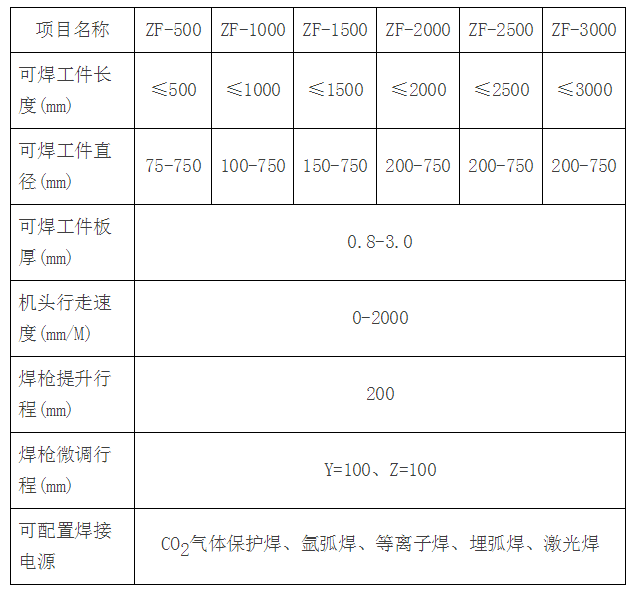 應(yīng)用范圍:技術(shù)參數(shù)項目名稱ZF-500ZF-1000ZF-1500ZF-2000ZF-2500ZF-3000可焊工件長度(mm)≤500≤1000≤1500≤2000≤2500≤3000可焊工件直徑(mm)75-750100-750150-750200-750200-750200-750可焊工件板厚(mm)0.8-3.0機頭行走速度(mm/M)0-2000焊槍提升行程(mm)200焊槍微調(diào)行程(mm)Y=1